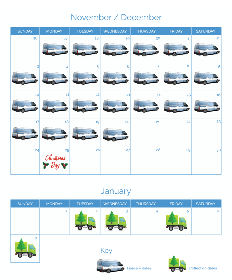 We deliver seven days a week through most of the festive season. For our exact delivery dates please see our calendar below.