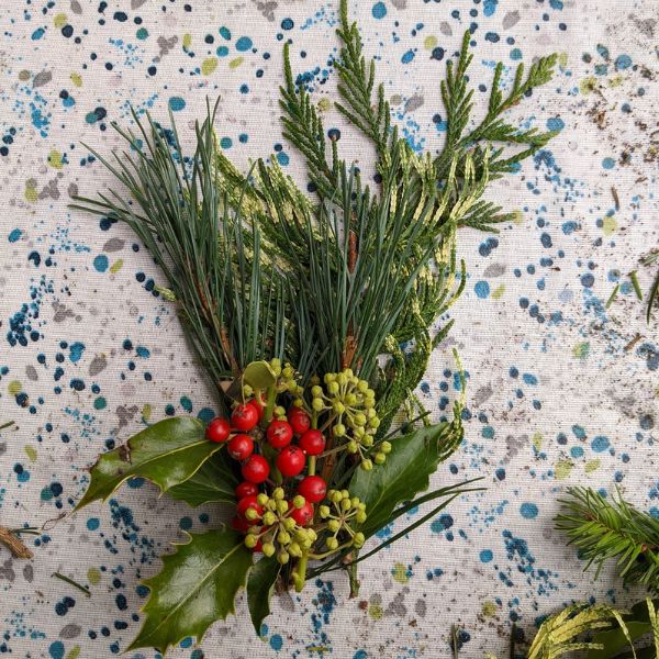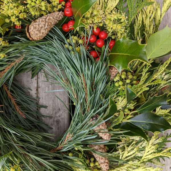 Holly, a variety of firs, pine, fir cones, pine cones, ivy, dried orange pieces and additional embellishments that vary based on seasonal supply