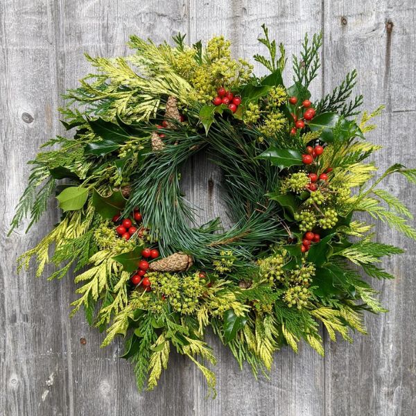 The all natural winter wreath is perfect to bring the look and smell of Christmas to any door, wall, mantelpiece or table. Every wreath is handmade and unique using beautiful foliage and berries sourced in Devon. The wreath is made from a mix of seasonal foliage with most elements picked from my garden or sustainably foraged. Wreaths include a mix of firs, pine, Holly and ivy and can be adjusted to individual requirements upon request.