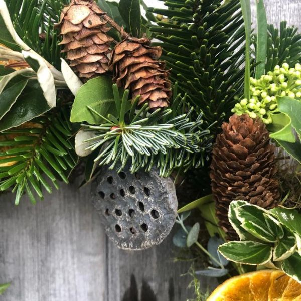 The all natural fir and eucalyptus Winter wreath is perfect to bring the look and smell of Christmas to any door, wall, mantelpiece or table. Every wreath is handmade and unique using beautiful foliage sourced in Devon and peppered with dried fruit, lotus heads and beautiful seasonal foliage. The wreath is made from a mix of seasonal firs collected from my garden and local area as well as a variety of eucalyptus from a sustainable eucalyptus plantation in my area.